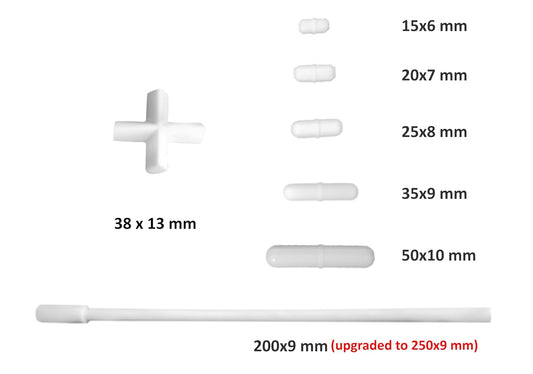 7pc PTFE Stir Bars Set - Straight (15,20,25,35,50 mm), Cross (38 mm), Retriever (250 mm)