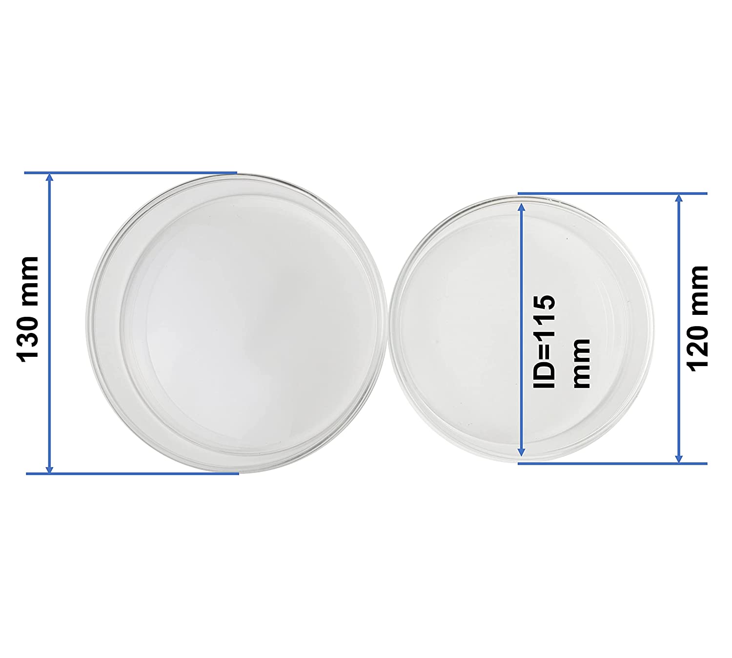 - Standard 120mm dish with lid. Inner diameter is 115 mm (surface area of about 104 cm^2)